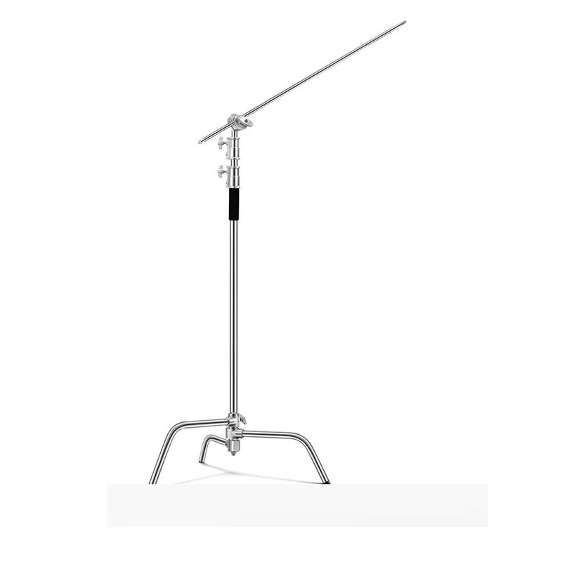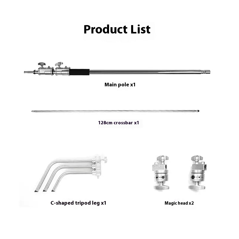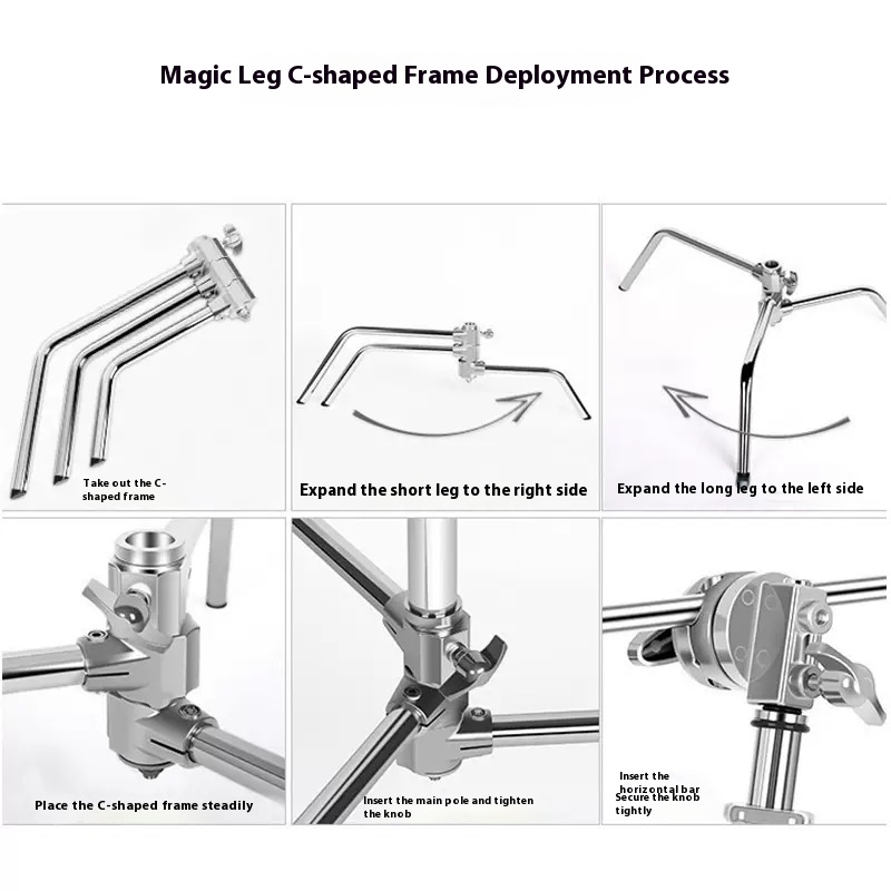Magic Leg C-Stand up to 3.3m tall , 25mm leg diameter . Non-Slip handle sponge , with two grips and boom rod for vertical and horizontal useage . Built-in spring buffer , two types of connector screw on the rod 1/4″ and 3/8″ .