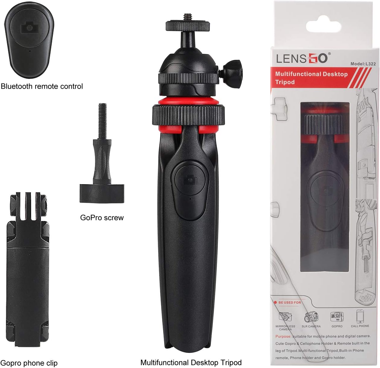 ميني ترايبود متعدد الاستخدام من شركة لينس غو ، رأس كروي يتحمل حتى وزن 3 كغ ، مع ريموت بلوتوث مثبت في احد الأرجل قابل للازالة . كلامب للموبايل مع أدابتر لكاميرات الغو برو . يتيح لك التصوير باكثر من كاميرا او جهاز في نفس الوقت .