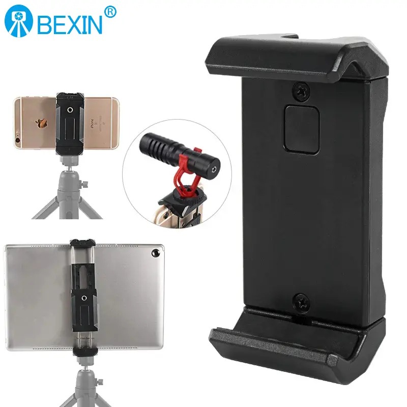 مشبك / كلامب للتابلت والموبايل ، مع هوت شو من الاعلى لتثبت اضاءة او مايك . مداخل تثبيت من الاسفل والخلف للتصوير الافقي والعمودي . الكلامب يتسع من 7.8 – 18.5 سم يناسب أغلب الموبايلات والتابلت في السوق .